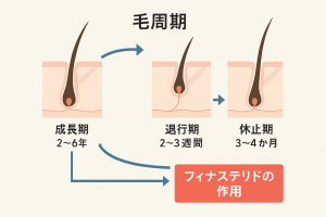 作用機序:5α還元酵素(Ⅱ型)を阻害し、テストステロンがDHT(ジヒドロテストステロン)に変換されるのを防ぐことで、毛髪のミニチュア化を抑制します。